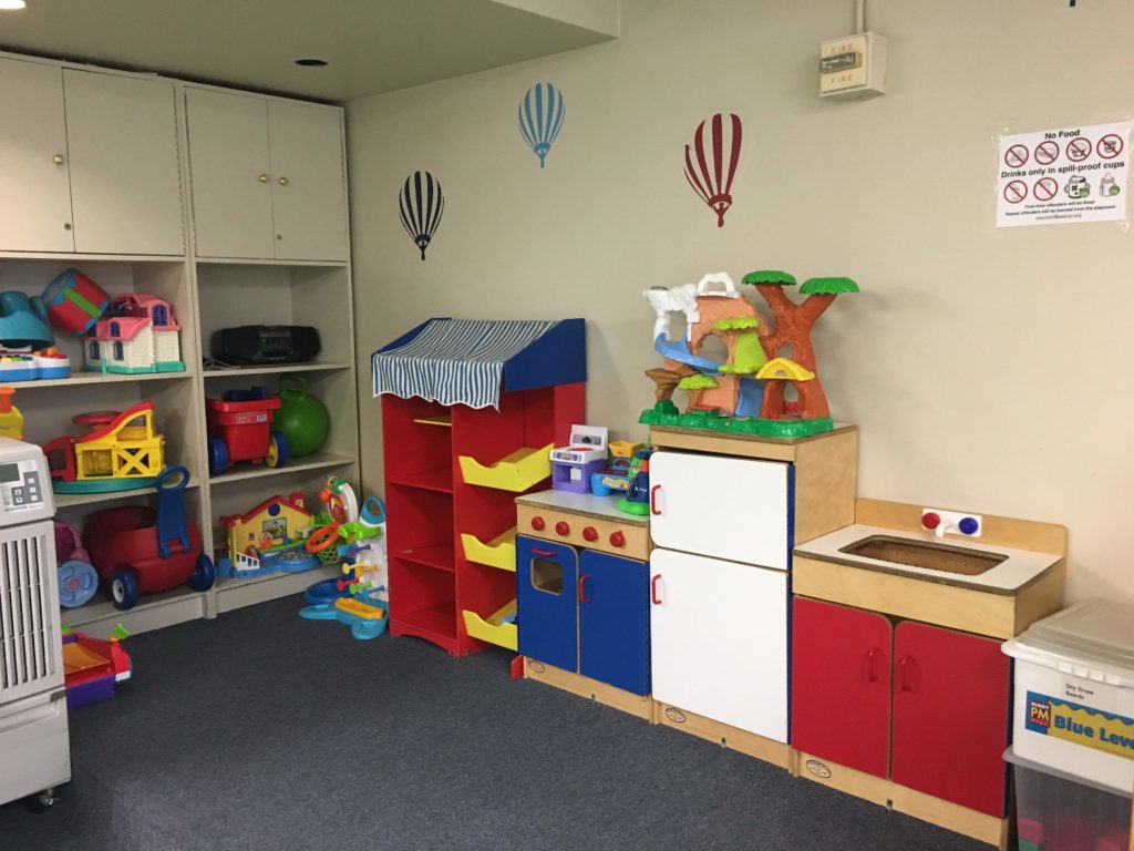 The Playroom is an indoor play area with a climbing structure and many toys and books. The floor consists of carpeting and soft foam playmats.